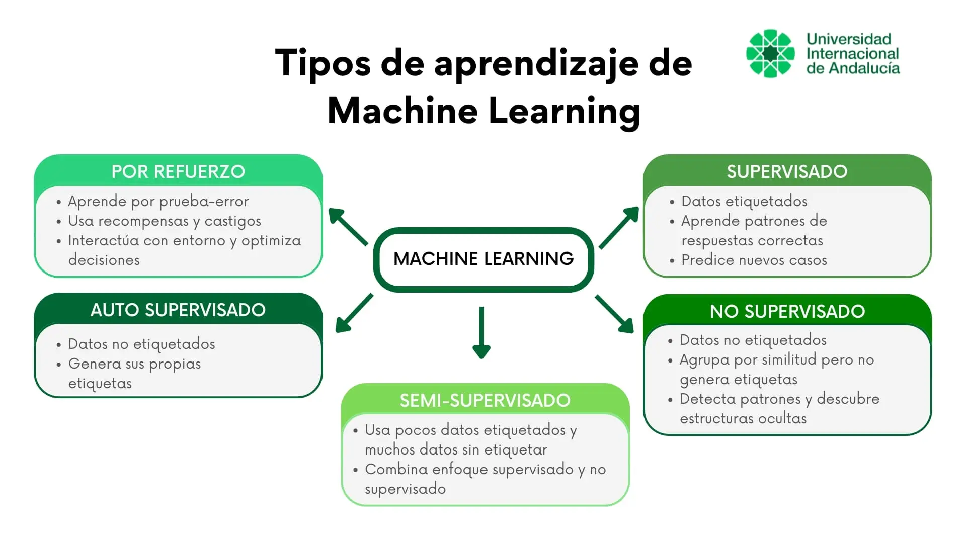 Dependiendo de la tarea que queramos realizar con el algoritmo y los datos disponibles, podemos identificar cinco distintos tipos de aprendizaje o algoritmos de machine learning: