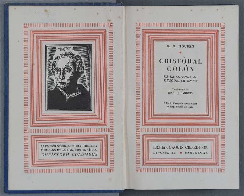 En el ángulo superior derecho de la hoja de guarda anterior plantea la siguiente inscripción manuscrita: "Cad. 24.906/ M-158/15 euros". En el verso de la anteportada, además del título abreviado de la obra, aparece a grafito una inscripción con la signatura actual, "COLÓN / HOU / cri", y en el reverso un tosco grabado rectangular con idéntica imagen al citado tondo de la encuadernación con el retrato de Cristóbal Colón. Ha sido realizado en tinta negra y enmarcado con distintas orlas lineales en color rosa, bajo el que se ubica la siguiente inscripción: "La edición original de esta obra se ha / publicado en alemán, con el título / Christoph Columbus". En la portada se repite estéticamente la sucesión de orlas rosas del grabado y, en vez del retrato de Colón, aparecen enmarcando el nombre del escritor, el título de la obra completo, "Cristóbal / Colón / de la leyenda al descubrimiento", el nombre del traductor, "Juan de Bandujo", y fuera de este texto, en el margen inferior "Iberia-Joaquín Gil-Editor/Muntaner, 130. Barcelona".