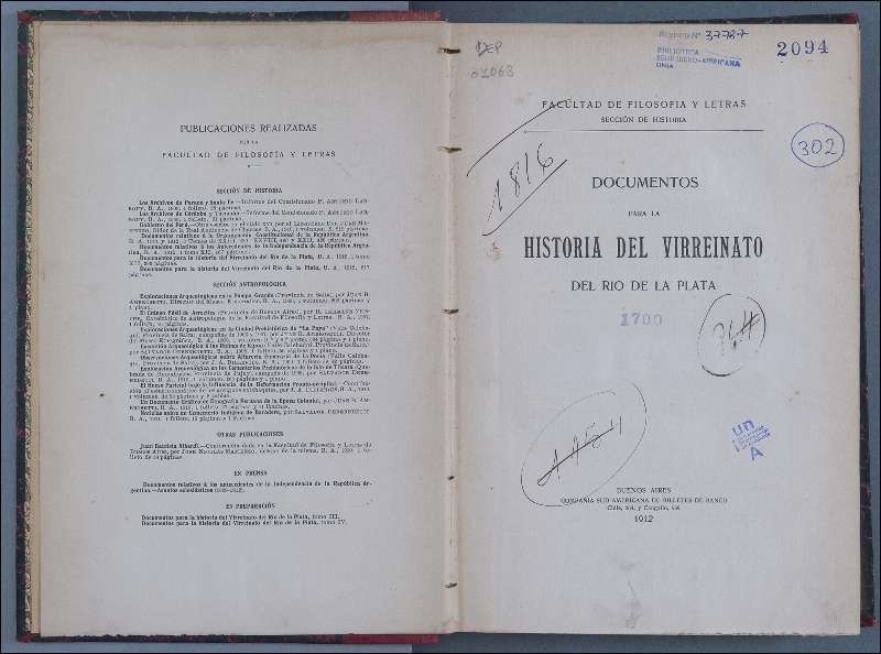 En la portada, en el margen superior se detalla la institución que ha encargado la recopilación de documentos que se aportan en la publicación, "Facultad de Filosofía y Letras, Sección Historia", en el centro se explicita el título de la obra y en el margen inferior el editor, "Compañía Sudamericana de Billetes de Banco". Presenta en este espacio diversas inscripciones manuscritas a diferentes colores de tinta y a grafito: "DEP / 01063" en el ángulo superior izquierdo, "302" y "86H [tachado]" en el margen derecho y, "1816" y "1154 [tachado]" en el margen izquierdo. Contiene en este espacio estampados cuatro sellos en tinta azul, "Registro Nº 37787 / Biblioteca / Sede Iberoamericana / UNIA" en el margen superior, "2094" en el ángulo superior derecho, "1700" en el centro y, finalmente, "UNIA" en el margen derecho.