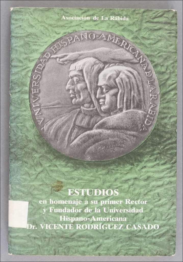 La obra "Estudios en homenaje a su primer rector y fundador de la Universidad Hispano-Americana Dr. Vicente Rodríguez Casado" fue escrita en 1988 por veinte investigadores, un autor por capítulo, que quisieron homenajear al primer rector que gobernó la citada Universidad con diferentes estudios de temática variada (en el índice aparecen solamente dieciocho y dos en la fe de erratas). Fue editada en Madrid por la Asociación de la Rábida e impresa en Anzos, S.A., una empresa de Fuenlabrada.