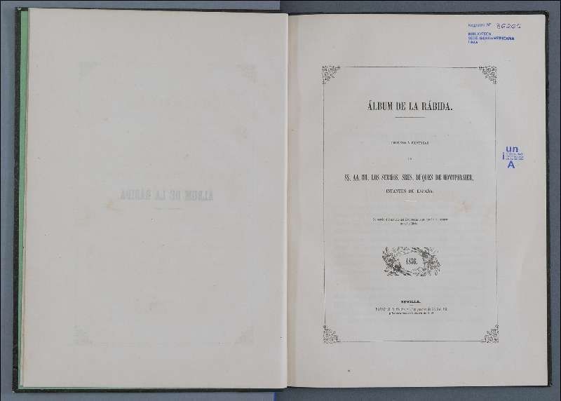Tras las hojas de guarda, la anteportada recoge el título de la obra impreso en negrita y subrayado por un elementos decorativo horizontal, todo ello inserto en una orla lineal con decoración vegetal muy estilizada en cada uno de sus ángulos (esta orla se va a repetir en cada una de las páginas encuadrando el texto). En la portada aparece el título del libro en el margen superior, en el centro "SS. AA. RR. Los Sermos. Sres. Duques de Montpensier, / Infantes de España. / Se vende a beneficio del Establecimiento que ha de ocupar / aquel edificio", y debajo una orla de rosas con el año de la publicación, "1856". En el margen inferior se cita el lugar y el encargado de la impresión, "Francisco Álvarez y Cª, Impresores de SS. AA.RR. / y honorarios de Cámara de S.M.". Se completa este conjunto con dos sellos estampados en tinta azul: "Registro Nº 36265 / Biblioteca / Sede Iberoamericana / UNIA" en el ángulo superior derecho y "UNIA" en el margen derecho.
