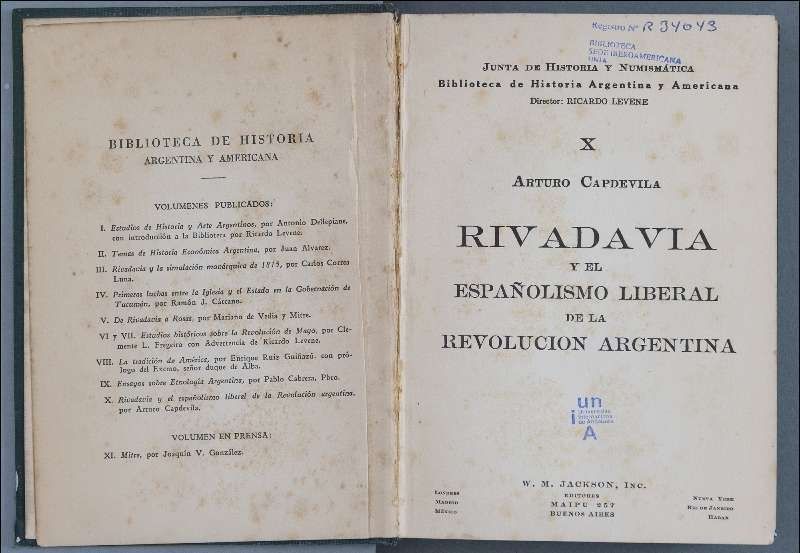 La obra "Rivadavia y el españolismo liberal de la Revolución Argentina" fue escrita por Arturo Capdevila en 1931 (esta fecha ha sido extraída de la página 5). Esta edición fue editada por "W.M. Jackson, Inc. / Editores / Maipu, 257 / Buenos Aires" (esta editorial tenía sedes en Londres, Madrid, México, Nueva York, Rio de Janeiro y La Habana, como así consta en el margen inferior de la portada). Nada se sabe de quienes o quienes fueron los impresores del libro, o si la propia editorial disponía de imprentas propias o asociadas que llevarían a efectos los trabajos.La Junta de Historia y Numismática de la Biblioteca de Historia Argentina y Americana, siendo su director Ricardo Levene, le encargó la redacción del tomo X de su colección a Capdevila.