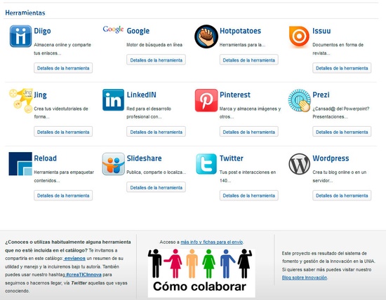 Además de para estar al tanto sobre web social y competencias digitales (e incluso, reutilizar su contenido conforme a la licencia Creative Commons bajo la que se publica), tanto docentes como estudiantes pueden, al igual que el propio personal de la Universidad, ir aportando al catálogo aquellas herramientas que conozcan y utilicen y consideren de interés. La forma es sencilla, como se describe en el apartado de Colabora del propio portal.