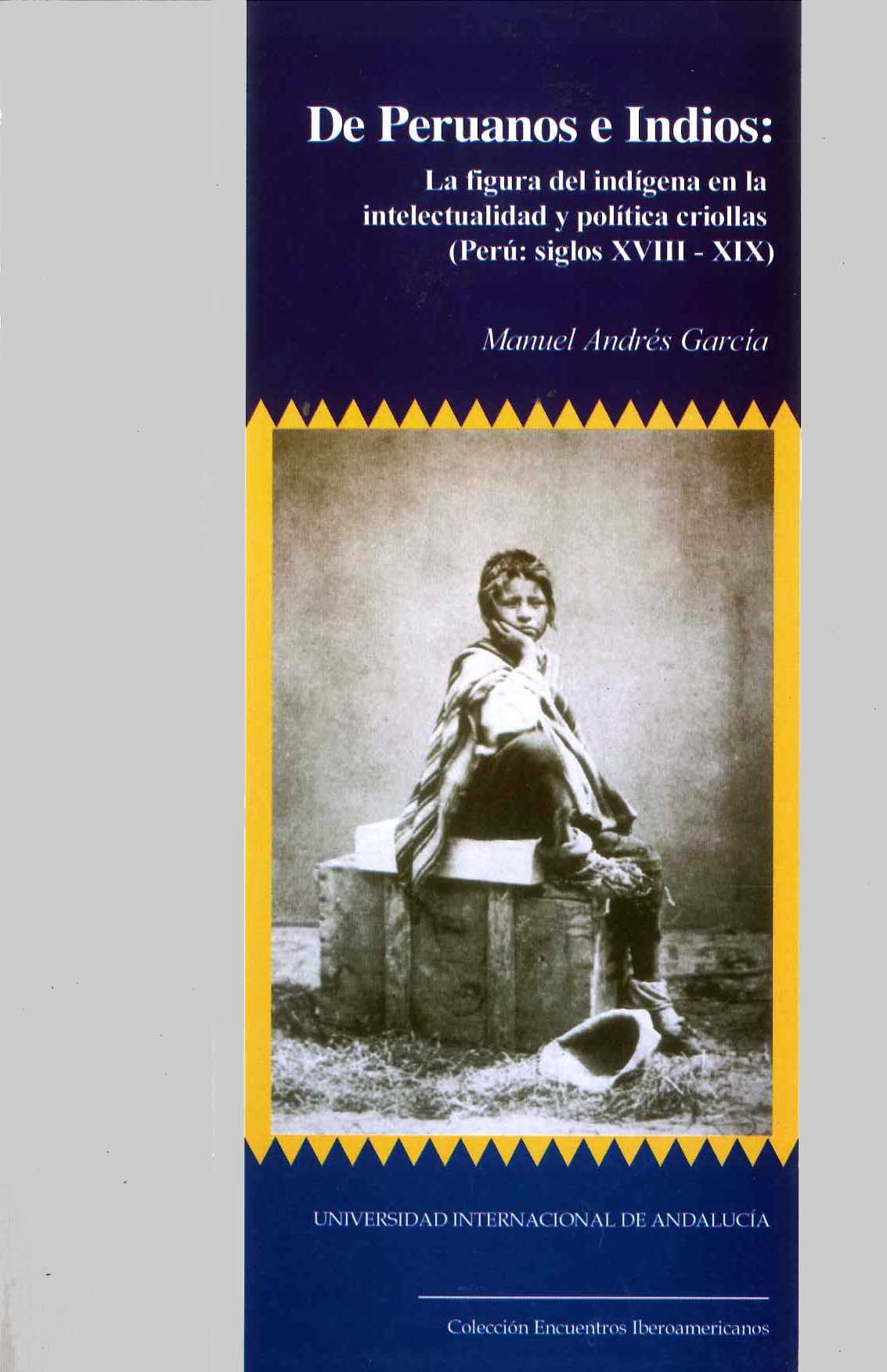 Colección "Encuentros Iberoamericanos", nº 10. Investigación histórica sobre la visión del indígena por los intelectuales y políticos del Perú durante las décadas finales del período colonial y el siglo XIX. Índice: I. Intelectuales, reformistas y revolucionarios. Los orígenes del discurso criollo sobre el temor al indio y su inferioridad. II. Emancipación y Caudillismo: la conformación de la ideología criolla y el indígena. III. Política, Ideología y Ciudadanía: El índigena en los primeros gobiernos civiles. IV. La Guerra del Pacífico: participación indígena y consecuencias. V. Política e Intelectualidad: del segundo militarismo al debate finisecular sobre el indio.