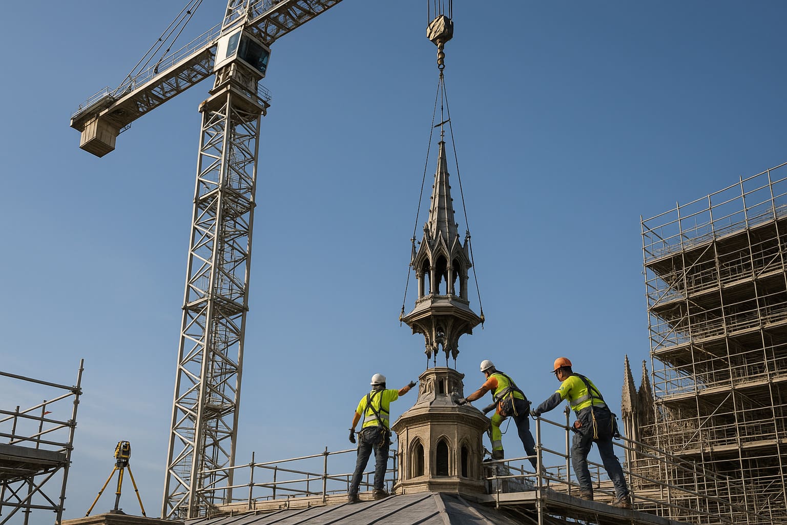 Se ejecutó la reconstrucción de la aguja conforme a los planos históricos, la reinstalación de esculturas y la finalización de cubiertas y ornamentos metálicos. El proyecto concluye con los controles de calidad y la calibración definitiva de los sistemas estructurales.